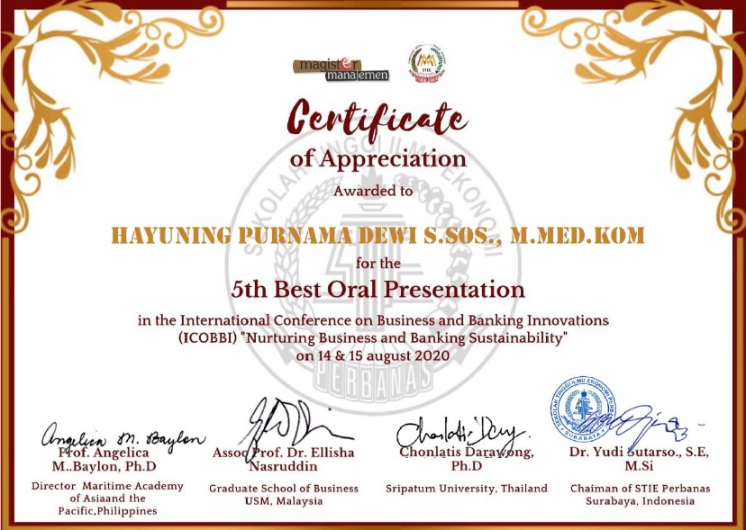 Peraih Best Presenter di 2nd International Conference on Business and Banking Innovations (ICOBBI) 2020