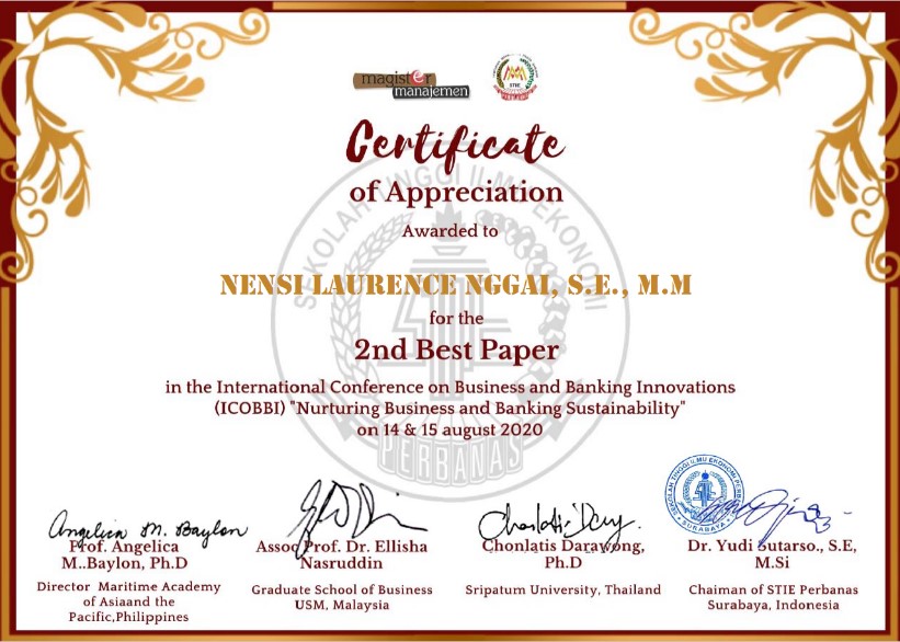 Best paper yang diraih oleh Nency Laurence Nggai pada The 2nd International Conference on Business and Banking Innovations (ICOBBI) 2020