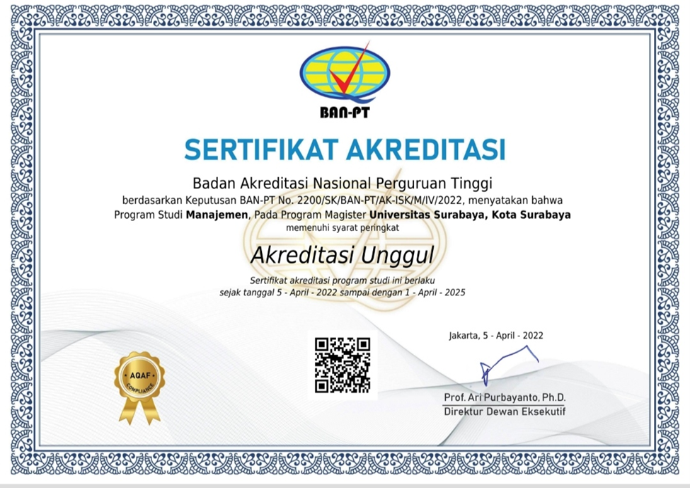 Hari Rabu, 06 April 2022, kembali MM Ubaya menorehkan satu prestasi lagi dengan diperolehnya Akreditasi Unggul dari Badan Akreditasi Nasional Perguruan Tinggi (BAN-PT). BAN-PT melalui Surat Keputusan Nomor 2200/SK/BAN-PT/AK-ISK/M/IV/2022 menyatakan program studi Magister Manajemen Ubaya dengan peringkat akreditasi Unggul terhitungn 05 April 2022 hingga 01 April 2025. Vivat Academia!